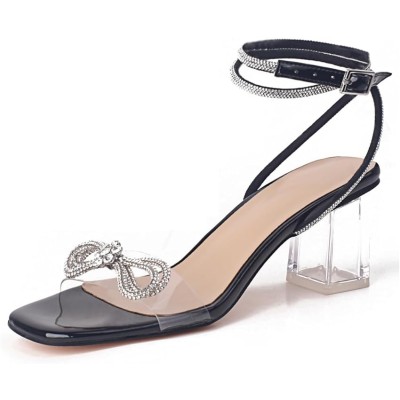 Women's Rhinestone Bow Heels Square Toe Clear Heeled Sandals Slingback High Heels