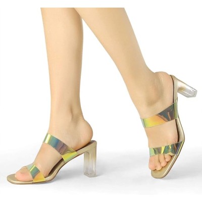 Women Transparent Two Strap Block Chunky Square Heel Sandals Open Toe Slip On Sandals