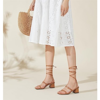 Women's Strappy Lace Up Heeled Sandals Black Nude White Gold Chunky Strap Heels