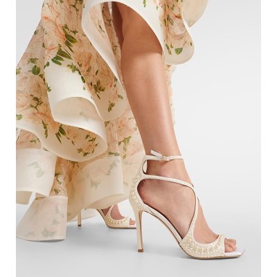 Womens Peep Toe Stiletto Heeled Sandals Shiny Pearl Buckle Ankle Strap Wedding Pumps Dress